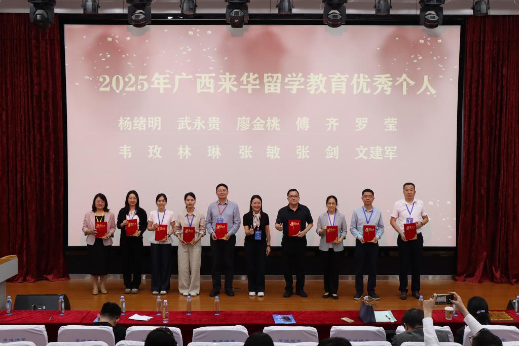 会议还表彰了在2025年来华留学工作中表现突出的单位和个人。15所学校获评2025年广西来华留学教育工作优秀单位,百余名工作者荣获优秀个人、优秀辅导员称号。